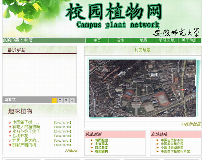 在一年多时间里,李治中、李明等同学对校园植物进行采集、拍摄,共鉴定植物68个科,约200种,获得专业植物照片约4000张,实景图20余张,涵盖了校园内绝大多数的木本和草本植物。网站采用植物实景定位图(木本植物)和网站目录检索系统两种方式检索,并通过专业照片显示植物形态,细节放大图展示植物各部分的详细特征,方便了师大同学学习和掌握常见植物的分类特征,理解相关知识的概念,也为广大植物爱好者了解和认知校园植物提供了平台。
