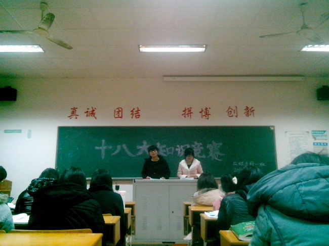 本网讯(余小飞 卞命杰 朱升学)为引导青年学生深刻领会和准确把握十八大报告和党章的内容,把思想统一到党的十八大精神上来,为实现中华民族伟大复兴而努力学习、锻炼本领,3月18日晚, 2012级生科一班班委组织全班同学以寝室为单位在教学楼1409教室举行学习十八大精神知识竞赛。竞赛分为必答题、风险题和抢答题三个环节。经过角逐,301、302、202寝室分别获得第一、二、三名。