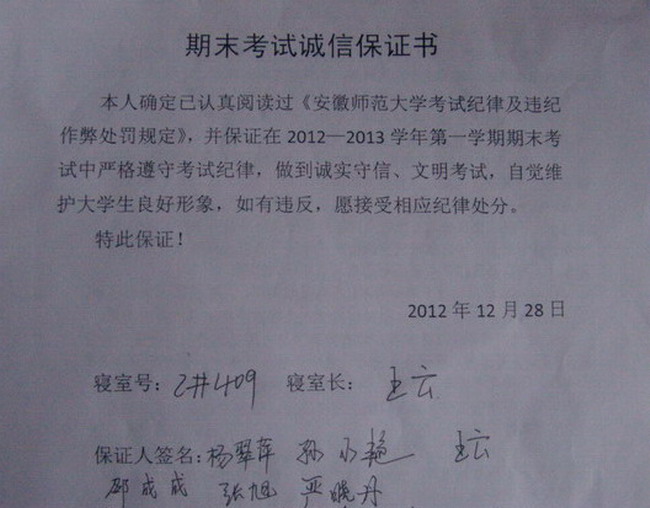 二是严肃考风严格考纪,杜绝考试违纪现象,营造良好学风考风。学院成立以党委书记为组长的考风考纪检查组,制定了学生考风考纪宣传教育活动实施方案,班子成员分工巡查,辅导员全程参加检查。组织学生认真学习《国家教育考试违规处理办法》和学校学生违纪处分规定、考试纪律及违纪作弊处罚规定、本科生课程考试管理办法等文件,强化学生考风考纪宣传教育。结合考试违纪典型案例教育学生自觉遵守考试纪律,让学生认清违纪作弊的严重性、危害性,抛弃侥幸心理,抵制和预防违纪作弊行为的发生,学院全体学生签订承诺书承诺诚信考试。