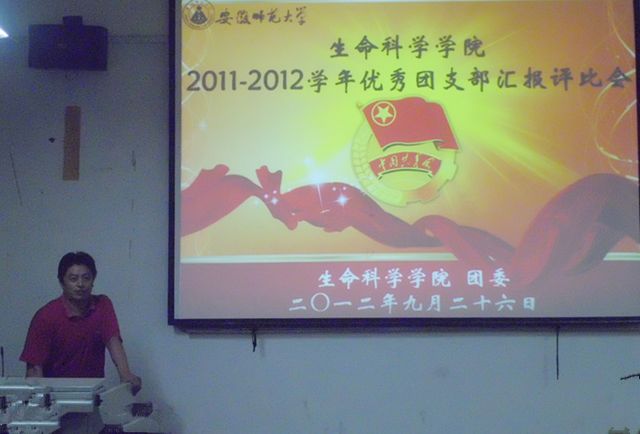 为进一步加强班集体和团支部建设,充分发挥班级在学生自我教育、自我管理和自我服务中的重要作用, 9月26日, 生科院2011—2012学年“先进班集体” 和“优秀团支部”汇报评比会在田楼8304教室举行,学院党委书记袁兴龙,团委书记汪倩倩、副书记贾瑞,辅导员朱升学、夏齐平、周科、张文君、李古州等出席并担任评委。汇报评比会由团委书记汪倩倩主持。