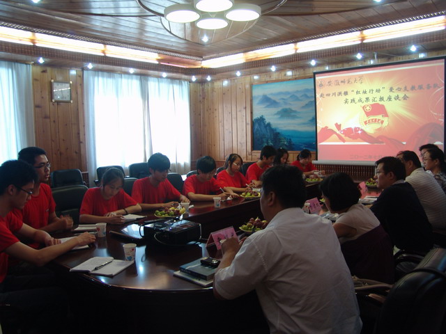 座谈会上,同学们踊跃发言,汇报了团队20多日来开展的各项活动及其所作的努力,畅谈了自己在社会实践中的体会和收获。刘新跃对同学们的表现给予了高度认可和充分肯定。他指出,社会实践是青年学生深入社会、了解社会、服务社会的重要途径,对于引导学生热爱祖国、热爱人民,增强社会责任感和使命感具有重要意义。社会是大课堂,社会实践是无字之书,青年学子要用心阅读、体味社会实践这本无字之书,志存高远、知行合一。刘书记说,赴四川洪雅“红烛行动”爱心支教服务队是我校今年暑期实践团队中行程最远、时间最长的团队,队员们不怕劳苦,克服了生活环境不适应、酷暑炎热等重重困难,圆满完成了社会实践活动,发扬了志愿服务精神,值得称道。最后,刘书记勉励同学们做到“四个好”:一要活动总结好。认真做好活动记录和实践总结,并进一步提炼提升,将感性认识上升为理性认识,努力深化实践理论。二要成果固化好。重视文字资料、活动图片的整理和保存,将优秀日志和图片汇编成册,固化实践成果。三要宣传示范好。做好活动宣传工作,发挥榜样示范作用,吸引更多志愿者加入到爱心支教活动当中,为西部发展贡献力量。四要感动延续好。要以本次活动为基点,永存爱心,积极服务社会;同时从实践中汲取养分,通过实践提升自我,努力成长成才。(生科院 汪倩倩