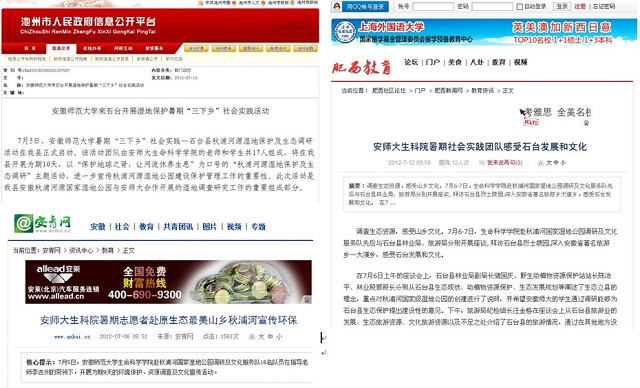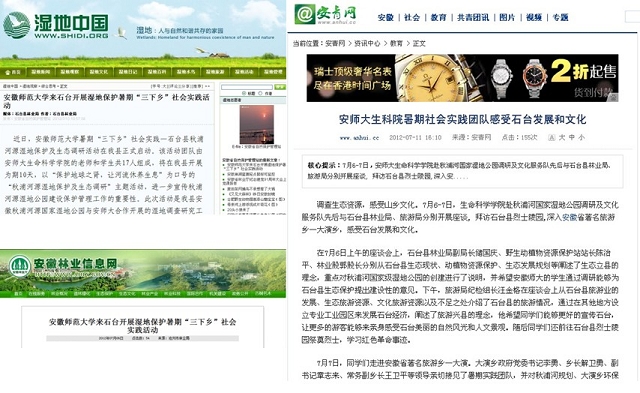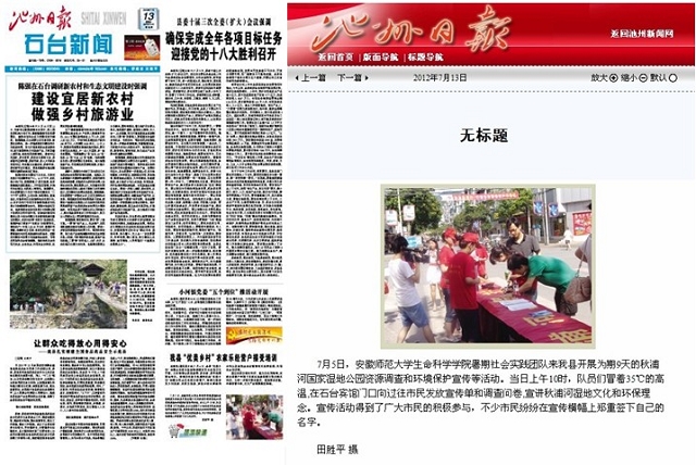 7月4日-7月10日,生科院赴秋浦河国家湿地公园调研及文化服务队走进中国原生态最美山乡-石台,开展秋浦河环境保护宣传、资源调查、文化调研等活动。活动的开展受到湿地中国、中国环保网、安青网、安徽林业信息网、江淮网、池州市人民政府信息公开平台、池州日报、石台电视台、肥西教育等多家媒体对活动的广泛关注和宣传,引起了较大的社会反响和良好的社会效应。