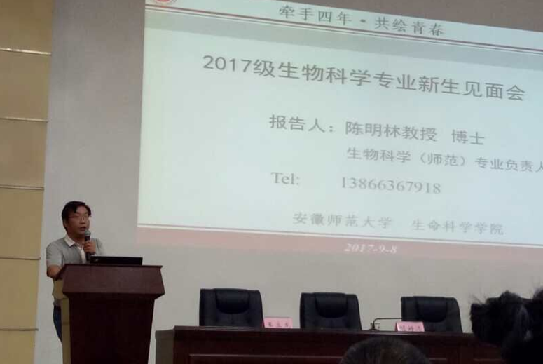 下午4:30召开了2017级生物科学专业新生师生家长见面会。会上专业负责人陈明林首先向新生与家长阐述了大学的不可替代性、生物学科的重要性与发展前景。然后分别就专业历史、专业定位、学分学制、授予学位、师资组成、软硬件设施、人才培养体系、课程设置、专业特色、就业前景等十个方面内容向学生和家长作了报告。会后与部分学生家长所关心的问题作了进一步交流。