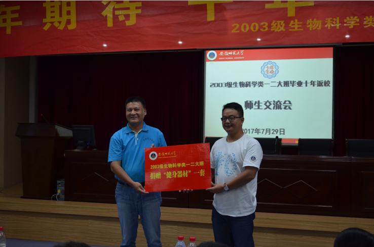 在下午的师生座谈会上,与会的学院领导朱国萍、胡好远,授课教师代表席贻龙、吴海龙、郝家胜、龚仁敏、王友保、陈明林、蔡亚非、陈冬生、黄永杰、程双怀、刘再群、晏鹏、卜兴江、王宝娟老师及辅导员汪贻洋与校友们共同观看了学校宣传片《追梦》,分享了母校取得的喜人成果。朱国萍副院长代表学院对校友们冒着酷暑返校表示热烈欢迎,向校友们长期以来对母校建设发展所给予的关心和支持表示衷心地感谢,并介绍了学院的发展近况,希望校友们继续关心和支持母院的建设和发展,常回母院看看。校友代表李琦、李刚、柳明、汪兴兰分别结合本职工作向母校汇报了自己十年来的成长历程,并代表全体校友感谢母校及恩师的教诲。教师代表陈明林、王友保老师深情回忆了当年的授课情景,对校友们在各行各业做出杰出成绩的送上衷心祝贺,因故无法到场的刘必融老师还为返校校友赋词一首。辅导员汪贻洋老师回顾了当年和同学们相处的点滴时光,表达了对同学们殷切的希望。为感谢母院培养,全体校友共同向母院捐赠了健身器材一套,祝福母院老师身体健康,快乐工作。