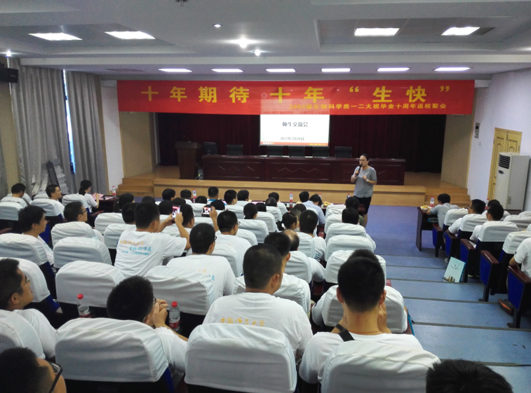 上午8点30分,在田楼8302教室里,身穿自行设计logo文化衫的校友们参加了主题为“十年期待 十年‘生快’”的班会。辅导员汪贻洋老师按照宿舍进行点名,大家集中观看大学影像视频,视频连线在国内外无法参会的同学,逐一回忆大学美好时光、重温了当年班会场景,欢笑、叹息、沉思、怀念……。返校校友们走出教室,一同走过留下四年美好回忆的情人坡、生化楼、宿舍楼、篮球场、操场、荷花塘……,赞叹母校母院的发展与变化、一起诉说着往日青春故事、共同追忆逝水年华、共同展望美好未来。校友们还回味了学校食堂午餐,参观了生物标本馆里的浓缩自然,录制了祝福母校90周年校庆的视频,举办了一场乒乓球友谊赛和掼蛋比赛,欢声笑语在学院楼里久久回荡。