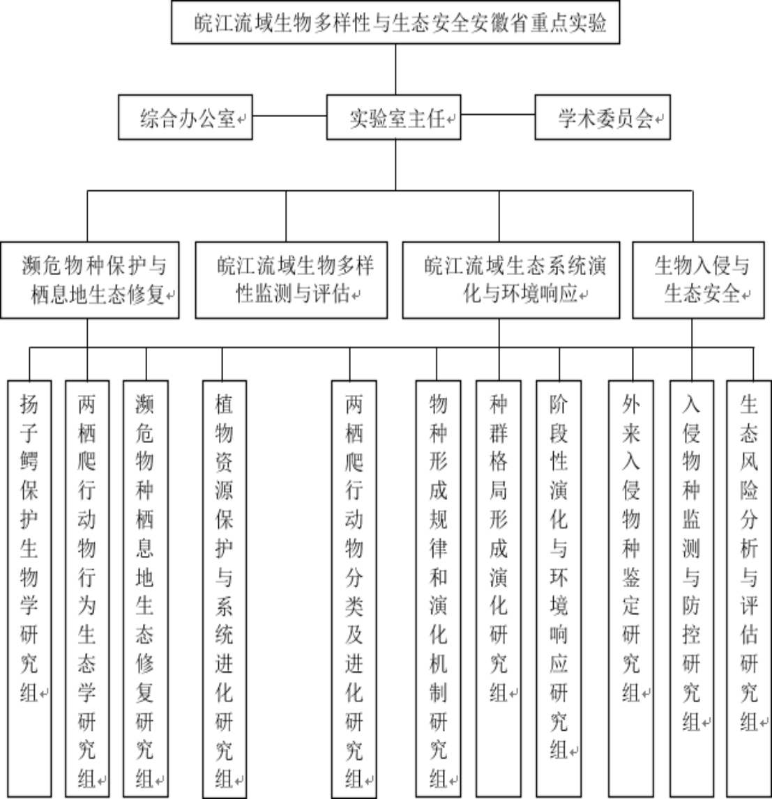 实验室基本定位:聚焦于皖江流域的生物多样性保护领域,紧密围绕皖江流域生物多样性保护的国家战略需求,以濒危物种的保护、复壮及生物多样性监测与演化为重点,开展基础理论和基础应用等方面的研究;发挥区域特色优势,开展生态保护、环境影响评估等应用研究,以指导本地区生态修复与生态环境的建设,服务安徽生态强省,让优质的生态资源为安徽省经济与社会发展作出实质性的贡献。