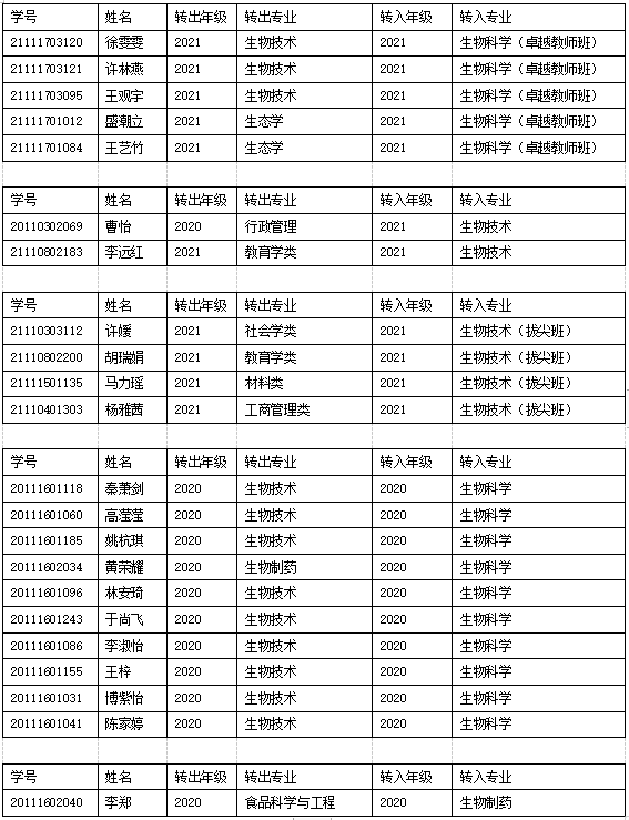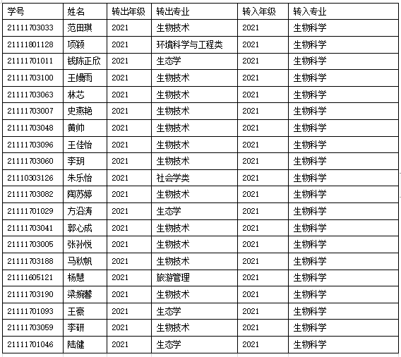 永利3044noc3044am永利集团官网2021级转专业考核工作组对自愿报名的同学进行了严格的笔试和面试,根据总成绩排名,2021级生物科学专业拟录取20名同学入班学习,2021级生物科学(卓越教师班)拟录取5名同学入班学习,2021级生物技术专业拟录取2名同学入班学习,2021级生物技术(拔尖班)拟录取4名同学入班学习;2020级生物科学专业拟录取10名同学入班学习,2020级生物制药专业拟录取1名同学入班学习。