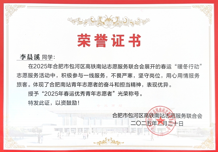 信中指出,李晨溪同学在春运“暖冬行动”中,以无私奉献和满腔热忱,为旅客送上冬日温暖,展现了当代青年的责任与担当。面对繁重任务,展现出极高热情和责任感,坚守岗位,为旅客提供全方位帮助:耐心解答疑问、协助购票取票;细心引导候车乘车、维持秩序;主动帮扶老弱病残及携带大件行李旅客,让他们感受到旅途的温暖。李晨溪同学不畏辛劳,不惧严寒,始终保持高昂工作状态,以实际行动传递志愿服务精神,赢得广泛赞誉和高度肯定。
