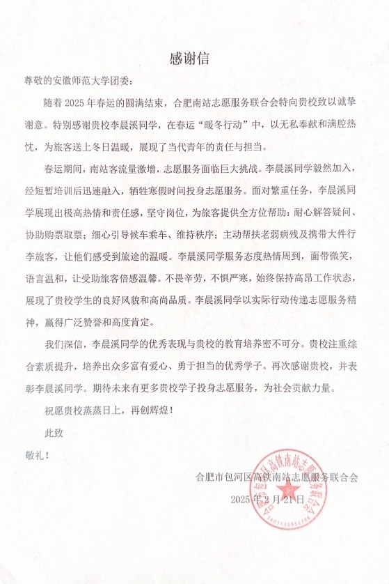 近日,合肥市包河区高铁南站志愿服务联合会向我校发来感谢信,对永利2024级生物科学(师范)李晨溪同学在参加2025年寒假社会实践活动的突出表现表示肯定与赞扬,对我校的支持表达感谢。