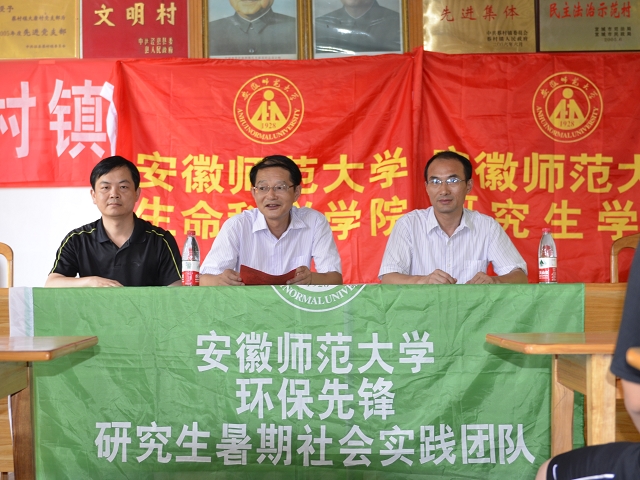 上午十点,队员们顶着七月的骄阳,汗流浃背的来到了蔡村镇月亮湾村——国家级绿色小康村。刚抵达时的些许疲倦和燥热,在清凉的山风吹拂过后倍感舒爽。队员们情绪高涨,在落脚点安顿好后立即举行了暑期社会实践活动启动仪式。本次社会实践活动得到了泾县政府、泾县环保局的大力支持与帮助。启动仪式上泾县环保局等单位领导亲临现场指导工作,对我校研究生来泾县开展“三下乡”活动表示热烈欢迎,并对环保宣传活动提出了很好的建议。