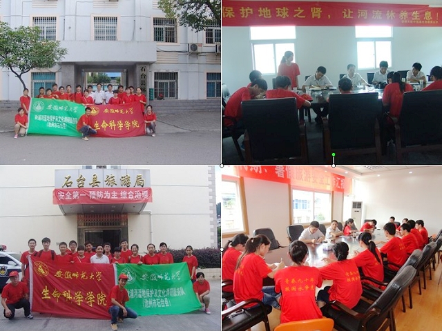 在7月6日上午的座谈会上,石台县林业局副局长储国庆、野生动植物资源保护站站长陈治平、林业股郭股长分别从石台县生态现状、动植物资源保护、生态发展规划等阐述了生态立县的理念,重点对秋浦河国家级湿地公园的创建进行了说明,并希望安徽师大的学生通过调研能够为石台县生态保护提出建设性的意见。下午,旅游局纪检组长汪金格在座谈会上从石台县旅游业的发展、生态旅游资源、文化旅游资源以及不足之处介绍了石台县的旅游情况,通过在其他地方设立专业工业园区来发展石台经济,阐述了旅游兴县的理念,他希望同学们能够更好的宣传石台,让更多的游客能够来亲身感受石台美丽的自然风光和人文景观。随后同学们还前往石台县烈士陵园祭奠烈士,学习红色革命事迹