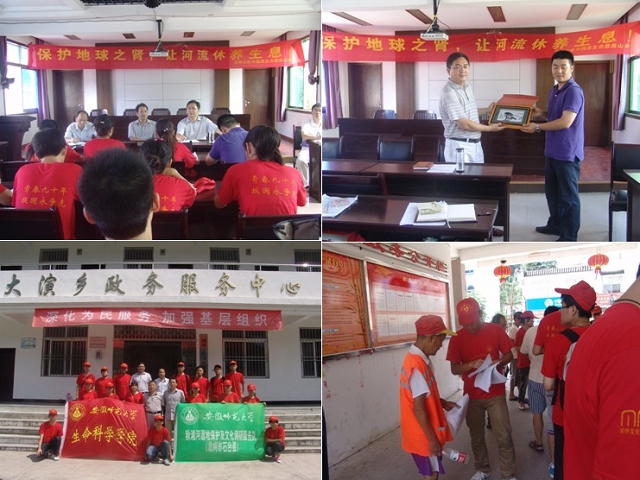 7月7日,同学们走进安徽省著名旅游乡—大演。大演乡政府党委书记李勇、乡长解卫勇、副书记章志来、常务副乡长王卫平等领导亲切接见了暑期实践团队,并对秋浦河规划、大演乡环保宣传、新农村建设、生态旅游以及科技支农致富等五个方面介绍了大演乡。随后同学们在大演乡政府开展秋浦河湿地文化宣传和新农村建设调研、农民满意度调查等。下午同学们沿秋浦河开展资源调查,了解大演历史文化,用相机定格千年古树,用标本展示珍贵资源。