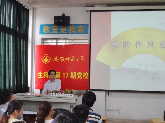 5月12日,生科院第17期入党积极分子培训班组织学员进行理论学习,学工部部长台启权应邀为学员作题为《党的作风建设》专题报告。