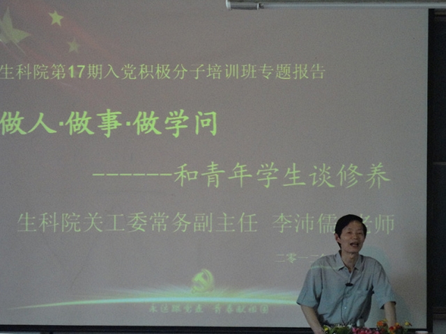 此次报告会是生科院关工委实施“党建指导工程”的具体措施,是对青年大学生关爱的一种体现,让学员们在党课学习中学做人、会做事。学员们也纷纷表示一定会不负众望,诚实做人、踏实做事,严谨做学问,争取成为一名优秀党员,为人民谋福利,为国家作贡献。(生科院毛琳)