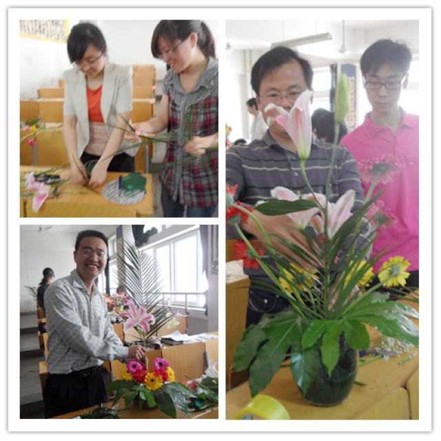 首先,涂老师从插花艺术、插花材料、插花分类和插话步骤四个方面向同学们进行了全面介绍。“每一件插花都倾注了创作者的思想和情感,有着深刻的寓意。”老师们准备了非洲菊、康乃馨、玫瑰、百合等丰富的材料,鲜艳的色泽和直接的参与强烈调动了同学们的积极性。大家集思广益,发挥想象与创新能力,在老师细致耐心的指导下,一件件挂着带有寓意标签的插花作品在眼前华丽绽放。最后,涂老师对每个同学的作品给予点评和指导,并提出了合理的建议。