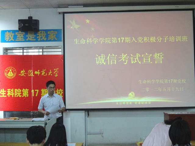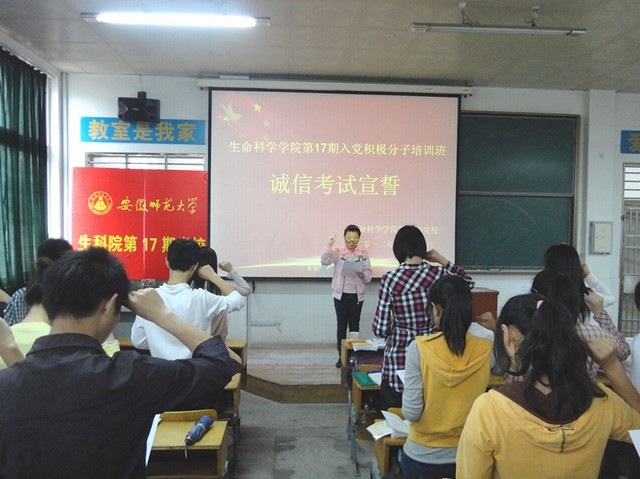 随着党课理论课程的结束和结业考试的临近,生科院第17期入党积极分子培训已经进入尾声。为提高学员诚信觉悟,培养学员责任意识,强化学员法纪观念,促进学员健康成才,将“讲诚信,树新风,筑文明”理念渗透到每一位入党积极分子的学习和工作中,帮助他们切实以党员标准严格要求自己。5月19日,党课班全体学员在物理楼3302教室举行了诚信考试宣誓和集体复习活动。党课班班主任郭志春主持本次活动。