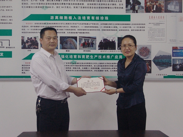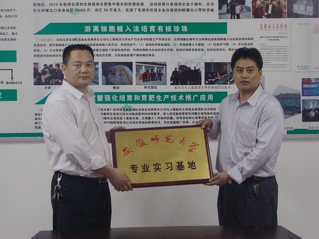 仪式上,生科院院长席贻龙与芜湖旺龙渔业有限责任公司法人代表王文先共同签署了校企合作建立校外专业实习基地协议,学院党委书记袁兴龙与王文先共同为基地挂牌,学院科研副院长朱国萍为王文先颁发校外实习指导教师聘书。
