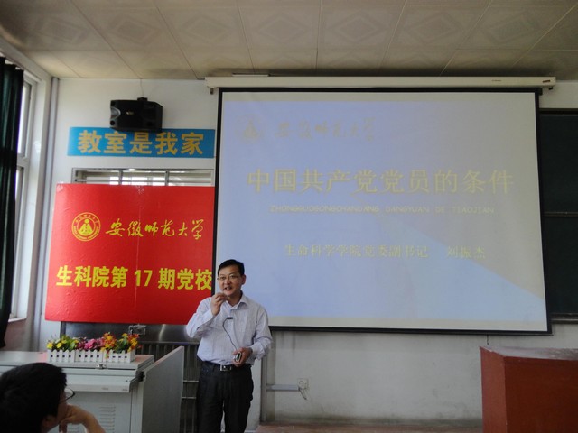 5月5日,生科院副书记刘振杰应邀在物理楼3302教室为第17期入党积极分子培训班全体学员讲授《共产党员的条件》党课。