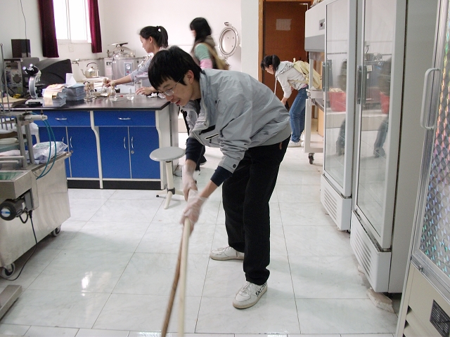 2点20分,105位同学聚集在生化楼前,并按学号分成8个小组分别打扫微生物实验室、发酵中心、细胞实验室等。走进每一个实验室,都能看到同学们忙碌不停的身影。男同学爬到窗台上清理每一个死角并主动承担拖地的任务;由于试验台抽屉不能抽下来打扫,女同学不怕脏乱和玻璃碎屑,伸出双手拣走或抹出每一片废屑;整理药品的同学仔细核对着药品试剂的名称,按照药品的性能仔细分类,擦净摆齐每一罐药品……