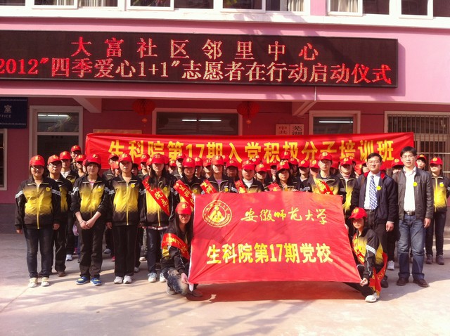 3月28日,为弘扬雷锋精神,做全面发展一代新人,生科院第17期入党积极分子培训班学员,走进大富社区举行“一米阳光2012四季爱心“1+1”志愿者行动启动仪式,组织开展真情关爱“空巢老人”和“留守儿童”活动。学院党委副书记刘振杰、党校班主任郭志春,镜湖区团委书记王兰、民政局局长徐骏,汀棠街道党委书记熊承松、主任芦义等领导出席活动仪式。大富社区志愿者、党校学员、“空巢老人”和“留守儿童”100多人参加活动。