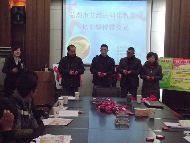 根据芜湖市、镜湖区疾控中心和校医院、生科院团委的合作安排,与会领导还为大学生“同伴教育”骨干员佩戴了象征“爱与关怀”的红丝带,要求他们深入开展校园预防艾滋病宣传教育活动,以实际行动积极参与创建美好校园。