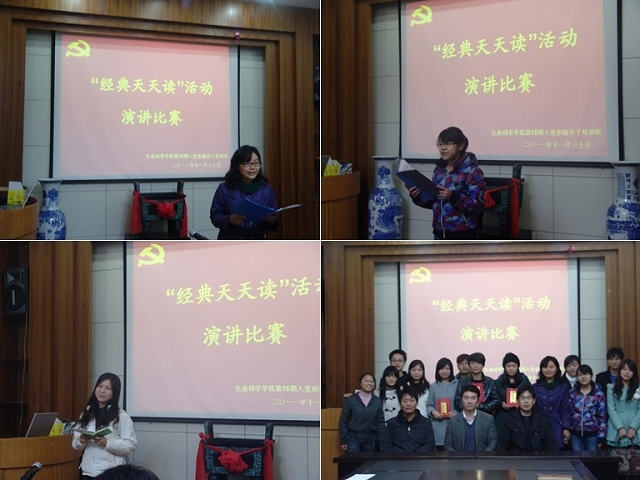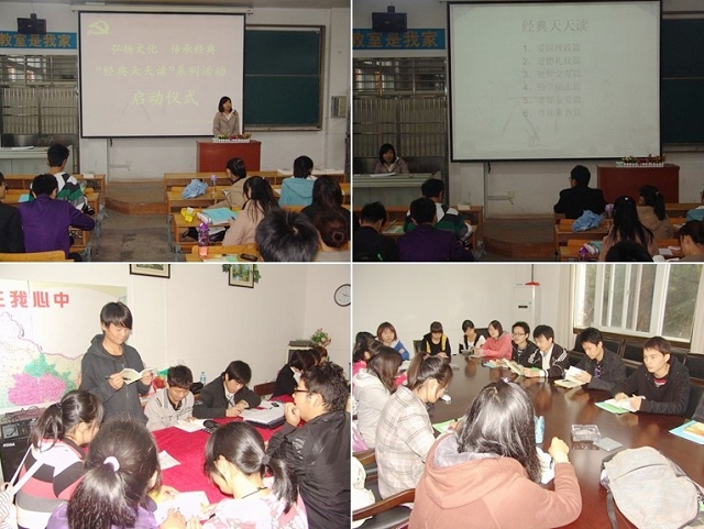 11月19日,学院党校启动“经典天天读”系列活动。全体学员在班长的带领下认真学习了“经典天天读”系列丛书的重要内容。学习结束后,学员们分组展开了热烈的讨论,阐述心得体会,争相交流见解。纷纷表示将会继续深入学习、领会“经典天天读”的深刻内涵,陶冶情操,不断提升自己的综合素养。集中学习后,党校班各小组领取教材并进行了小组学习,座谈。学员们积极撰写读书笔记、思想汇报。在评选推荐基础上,11月30日上午党校班举行了“经典天天读”演讲比赛。每位参赛选手围绕“爱国理政 、道德礼仪、处世交友、勤学励志、孝悌友爱和尊师重教”等内容为主题,紧密结合自身学习经历与生活经验,分别按照抽签顺序进行演讲。演讲过程中,各位选手紧扣主题,畅谈读书心得与感悟,以鲜活生动的事例、积极向上的内容和激情四溢的表达,从不同角度深入诠释了大学生入党积极分子传承经典、学以致用、服务人民的坚定决心和豪情壮志。