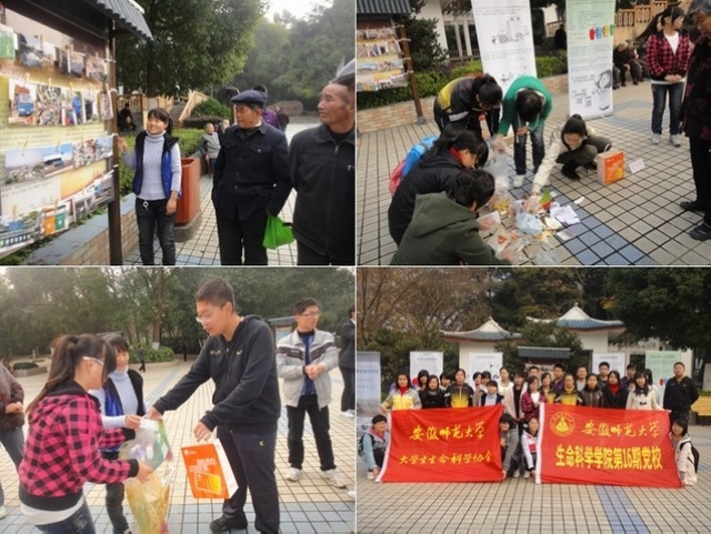 推进绿色工程,你我义不容辞。11月23日下午,学院分党校学员携手大学生生命科学协会绿色志愿者走出校园来到赭山公园,进行环保宣传。党校班学员与生科协理事通过易拉宝、问卷等形式向过往行人介绍了目前国内垃圾处理的现状以及垃圾焚烧的危害,并详细地解答了市民就垃圾议题方面的疑惑。许多市民就绿色生活理念和志愿者们展开了热烈的讨论。一位退休老人说:“这几十年来,我亲眼目睹了环境的变化,回想起来,真叫人触目惊心。其实像这些垃圾有许多是可以回收利用的,只是我们没有做好分类工作。地球是大家的,需要每个人的精心呵护。这个活动号召我们全市人民坚持绿色低碳的生活方式,意义深远。”