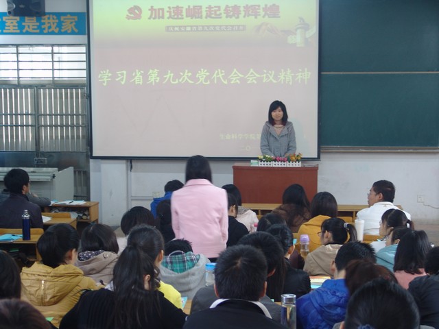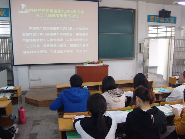 学员们首先通过视频认真学习了省第九次党代会精神。安徽省第九次党代会是全省“十二五”顺利开局的新形势下召开的一次重要会议。大会全面回顾和总结了过去五年的工作成效和基本经验,科学分析了当前的形势和任务,对未来五年安徽省各项工作作出战略了部署。视频学习结束后,学员们就省第九次党代会精神展开了热烈的讨论,纷纷发表自己的见解,阐述心得体会。10级学员代表王海霞谈道:“张宝顺书记的报告,立意高远,具有很强的针对性、指导性,特别是提出“走出六条新路”、打造“三个强省”,鼓舞人心,催人奋进。激励着我们当代大学生为建设祖国美好未来而努力奋斗。”