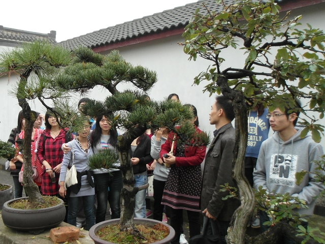 “盆景是一种源于自然的艺术,是自然界的缩影,源于自然而高于自然”,在葛老师的介绍下,同学们仔细的参观着大量精致的盆景作品,展出的作品大多是松树、柏树、白蜡、紫薇和榆树等,不时还能看到鲜艳的老鸭柿和可爱的柚子挂在树上。“盆景艺术体现了作者自身的艺术修养,也表达了一种意境”,在老师们的细致介绍下,同学们还学到了盆景制作的流程和方法。之后,同学们自由活动,对园中千奇百态的盆景作品进行记录和拍照,并就感兴趣的问题进行提问。过程中,老师倾囊相授,同学们也听得专心致志。老师们风趣幽默的语言和独到的见解调动了同学们的积极性,频频互动,反响热烈。