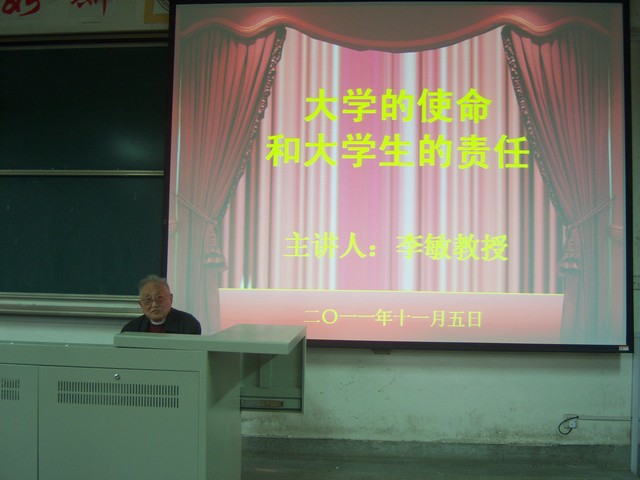 11月5日下午,应生科院邀请,校“关心下一代”工作委员会报告团负责人、离休老干部李敏教授为2011级生物科学专业学生做了“大学的使命和大学生的责任”主题讲座,讲座由辅导员张文君主持。