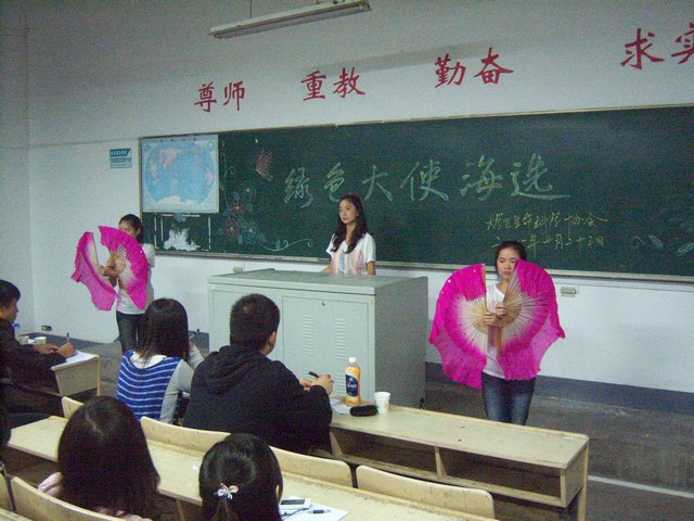 绿色志愿者选拔以笔试形式开展。笔试现场纪律良好,考风端正,同学们以极大的热情书写对环保的态度与见解,展示独特的思维,诠释新的环保理念。绿色大使海选现场,170多名参赛者各自展现出了自己的看家绝技。海选分为三个环节:才艺展示、绿色宣言和环保知识问答。优美的歌声,曼妙的舞姿,娴熟的弹唱,幽默的话剧……节目多样,丰富多彩,让评委们应接不暇,难以抉择。除此之外,参赛者响亮的宣言和丰富的环保知识更是让评委们赞叹不已,同时赢得了场下同学们的阵阵热烈掌声。在轻松愉快的氛围中,海选活动圆满落幕。