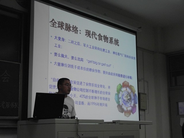 辛林强是中国人民大学可持续发展高等研究试验区姬山书院办公室主任、历任陕西省大学生支农队负责人、中国人民大学乡村建设中心“人才计划”西北区负责人,唐义国为中国人民大学乡村建设中心“农村可持续发展人才培养计划”学员,他们均是环保志愿者、生态农业生产消费者、可持续发展生活倡导者。两位主讲人着重讲解了生态农业的相关知识,鼓励青年大学生转变固有思维模式,走可持续发展的道路,在有机农业和生物动力农业方面大展宏图。他们提到:“作为生物专业的我们,尤其要坚持“关注农村、关爱农民、支持农业”的发展宗旨,背负起当代大学生的使命,把所学运用于实践做“四有”新人,充分发挥自己的价值,为“三农”服务。此外唐义国向大家介绍了志愿者的性质、志愿工作的意义,辛林强就当代文化走向及青年大学生的选择展开讨论。新农村建设、志愿服务与青年人的选择三个话题相辅相成,引起了台下同学们的积极参与。一位新生发言:“作为生科院的一名学生,我有信心也更有优势,拿出志愿服务精神,为农村的可持续发展添砖加瓦,成就自己的梦想。”
