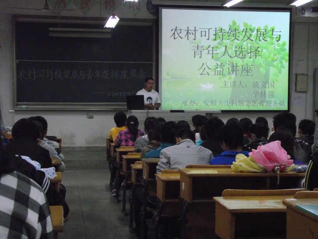 10月29日,3044am永利集团官网志愿者服务队在田家炳教学楼8103教室举办了“农村可持续发展与青年人选择”安徽省大学巡回公益讲座。主讲人为唐义国、辛林强,近百人到场学习并积极参与讨论。