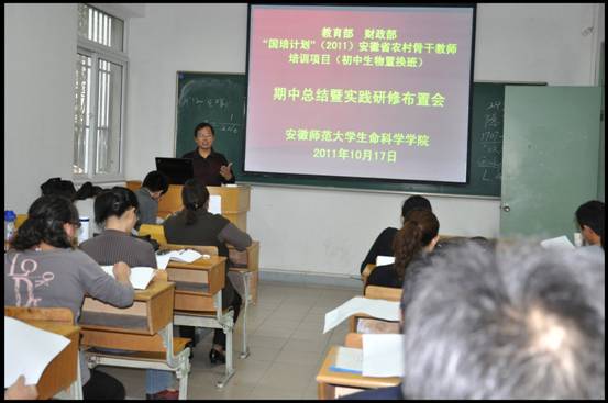 10月17日下午,“国培计划”(2011)初中生物置换研修班在安师大继续教育学院105教室召开了“国培计划”期中总结暨“影子教师”实践研修布置会,会议由班主任涂传林老师主持。