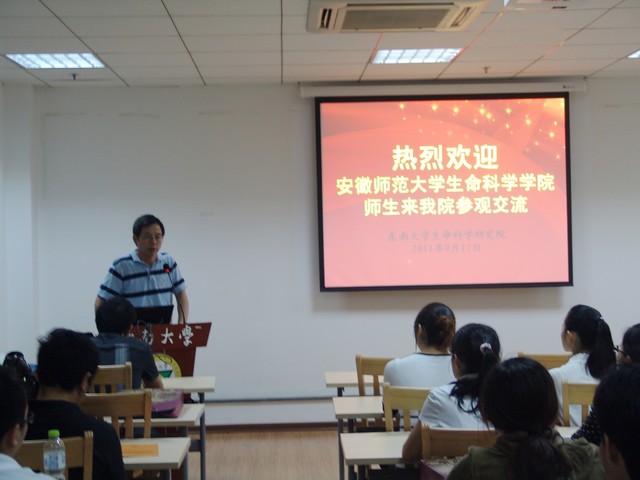 为帮助推免生联系接收单位和考研同学了解报考学校,开展人才培养合作交流,2011年9月17日,生科院党委书记王景旭、院长席贻龙、副书记周伍带领毕业班辅导员和18名2008级本科生代表赴东南大学生命科学研究院参观访问。访问受到了东大生命科学研究院党政领导和课题组长的热情接待。