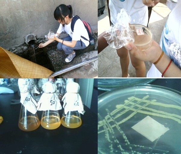 7月3日下午团队回到学校,刘爱民老师为队员们作微生物检测实验技术的相关指导。7月4日至9日,队员们分别对10个接种培养基中的微生物进行培养—接种—培养—分离、接种—培养等实验操作,一段时间后,通过对培养基中菌落的形状、大小、菌丝、颜色的观察,分离出五种细菌,再对这五种细菌进行试管斜面接种、培养。10日队员们分别对五种细菌进行革兰氏染色,并配置15个灭菌的液体牛肉膏蛋白胨培养基;7月11日至12日,队员们在刘老师的指导下,利用配置好的培养基设置科学的实验步骤检测出这五种微生物的最适生长温度,完成实验报告。