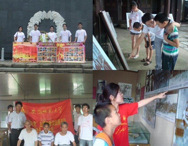 17日,队员们来到素有“新四军的摇篮”之称的云岭,参观全国首批重点文物保护单位——云岭新四军军部旧址,军部旧址再现了当年新四军在皖南的光辉历史。为了使爱国主义教育深入孩子的心中,队员们带领当地小学生一同参观了叶挺桥、碑园、司令部、大礼堂、修械所、东南局、政治部、新四军史料陈列馆等,并向他们讲述了新四军的英雄事迹,孩子们深受感动。队员们还向前来参观的游客发放宣传单和调查问卷,宣传红色历史红色精神;对博物馆相关负责人进行了采访,进一步了解革命历史;与同来参观的合工大、我校体育学院、化材学院的暑期社会实践团队相互交流,共同学习老一辈不畏艰苦,敢于牺牲的革命精神。