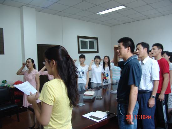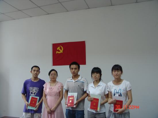 新老党员面对鲜红的党旗,庄重地举起右手,握拳过肩,表达了对党的郑重承诺,庄严的誓词激荡人心,激动的心情难以平静。接着,09级学生党员杨璐带领大家回顾了党90年波澜壮阔的发展史。最后,贾老师在讲话中指出,在建党90周年来临之际、在暑期离校前夕、在各团队即将奔赴实践基地之时,举行新党员重温入党誓词会议意义重大,希望各学生骨干将对党的坚定信仰内化为实践的动力,在暑期社会实践中增才干、展形象、创先进,以实际行动向党的九十华诞献礼。