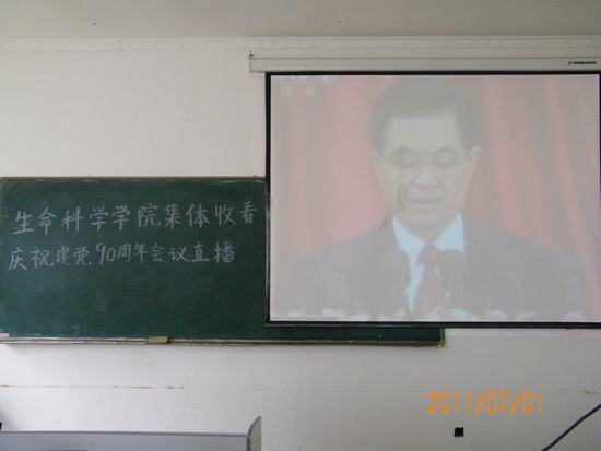 7月1日上午,庆祝中国共产党成立九十周年大会在北京隆重举行,胡锦涛总书记在大会上发表了重要讲话。生科院组织部分留校师生通过电视直播集体收看了大会实况。