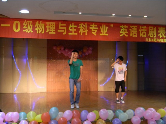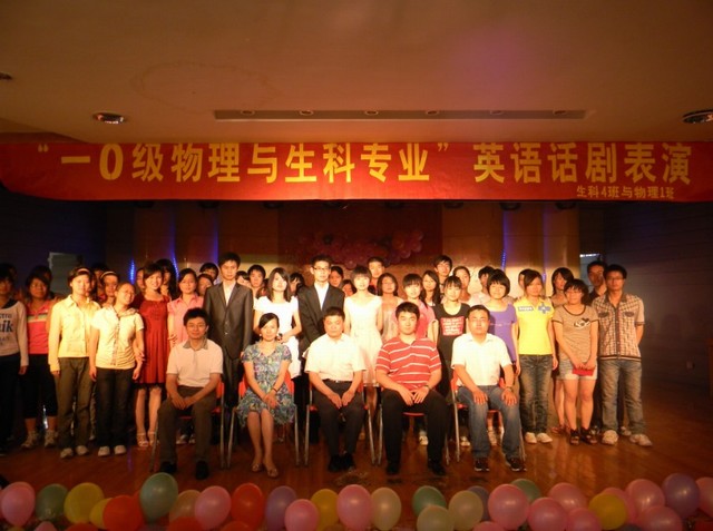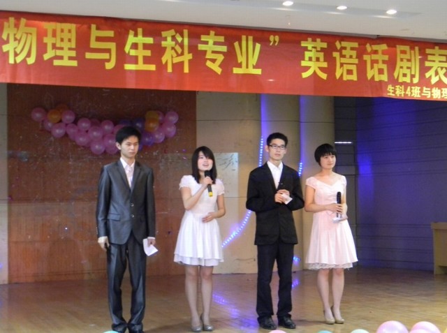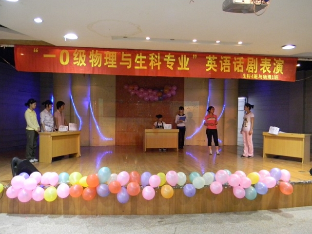 为了增进2010级生科和物电专业之间的交流,增强同学们的英语听说能力,丰富同学们的课余生活。5月7日下午,2010级生物科学教学3班和2010级物理1班在校团委多功能厅联合举办“英语话剧”演出。外国语学院黄朝俊、张小琴老师,10级生物科学辅导员李古州、班主任刘坤,10级物电辅导员倪健等到场观看了表演。