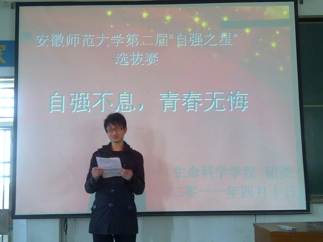4月10日下午2点生科院在赭山校区教学楼1105教室开展了以“自强不息,青春无悔”为主题的第二届“自强之星”评选活动。院团委副书记贾瑞、学生会主席魏露以及部分学生干部出席本次活动并担当评委。参加评选的同学有:周东东、蔡凌睿、陈枉枉、沈维民、程慧茹、王秀、刘文彪、杨飞等。