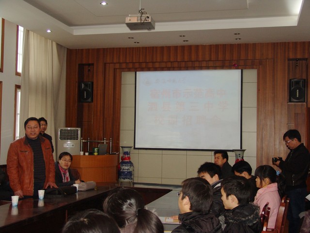 在泗县三中的就业信息发布会上,三中校长庄亚对招编户口、名额、以及教师薪资待遇等问题作了详细介绍,并对应聘毕业生提出了期望。