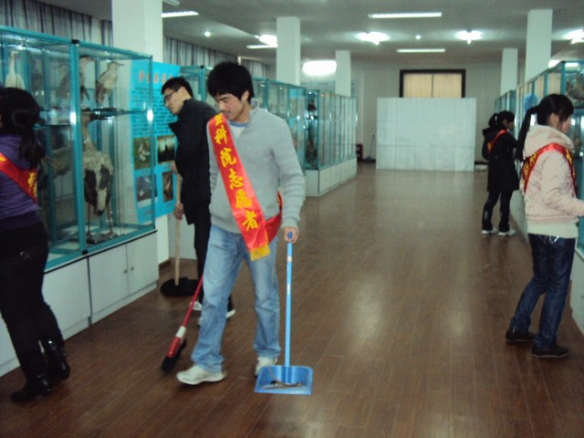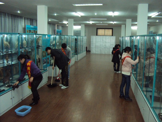 “创先争优我先行,生科学子当先锋”,3月12日下午,学院青年志愿者环保小分队开展了一场清洁安师大生物标本馆的志愿服务活动。大家自备工具,明确分工,协同劳动,有条不紊的对浸制植物标本馆、剥制动物标本馆、生态馆等9个分馆的每个角落进行了认真彻底的清洁打扫。在约4个小时的忙碌中,志愿者们个个热情高涨,不怕脏不怕累,将标本馆展柜、地面等都擦拭的焕然一新。