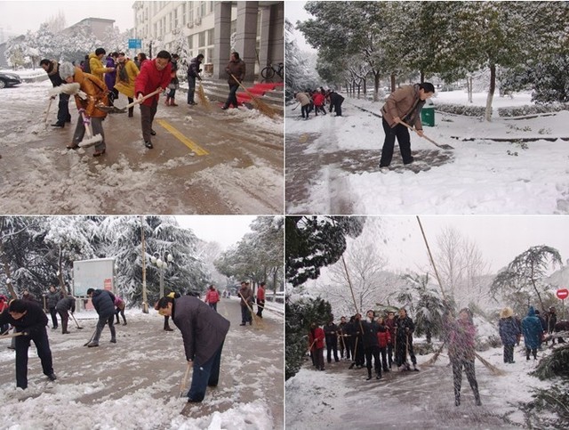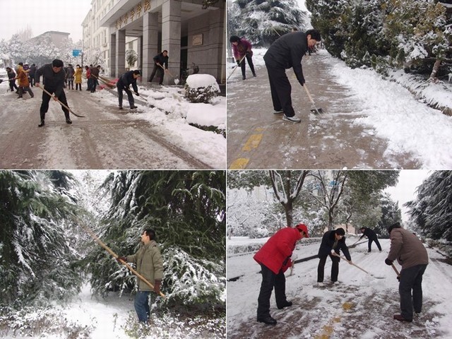 20日下午,接学校抗雪防冰救灾指挥部《关于做好抗雪防冰工作的紧急通知》,生科院紧急组织全院教职工开展清理清理责任区范围内道路和树冠积雪(教学楼周边―西大门(含三幢平房)―物理楼后(含二大楼))。学院领导班子带领教职工手持各种工具,“铁锨、扫把、木棒”一起上,踏着厚厚的积雪,不惧严寒和冰雪,不停的铲雪、扫雪、推雪。大家分工合作,干得热火朝天,虽然室外气温-2℃,但一个个汗流浃背。经过近1个半小时的紧张铲、推、拉、扫,生科院责任区内道路和树木积雪清理完毕。(生科院 李古州)