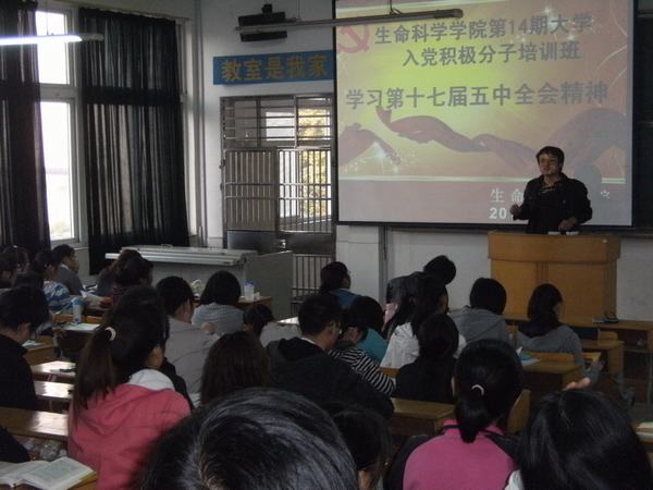 11月7 日下午,生科院第14期入党积极分子培训班在物理楼3402教室开展专题学习交流会,认真学习十七届五中全会精神。培训班全体学员参加了学习交流会,会议由班主任张文君主持。