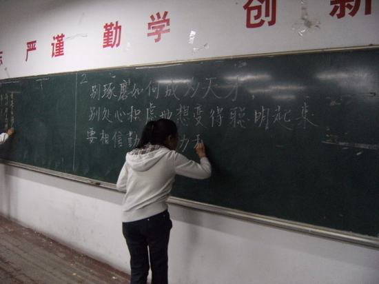 比赛要求选手们在规定的时间内同时完成毛笔字、硬笔书法和粉笔字三项创作。伴随着中国古典乐曲的优美旋律,选手门尽情发挥,书写出一幅幅别具风格的书法作品。最后,王小伟和周阿胜两位同学荣获比赛一等奖;张业功、王哲、柳俊先和方翔四位同学荣获二等奖;葛亚美、贾小力、耿莹和黄真珍四位同学荣获三等奖。