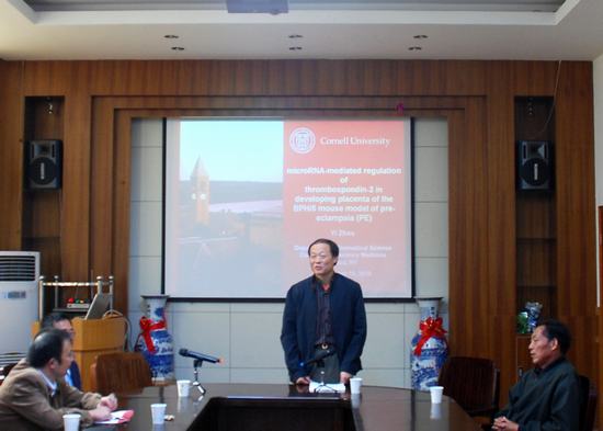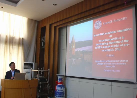 10月19日下午,应生科院邀请,美国康乃尔大学生物医学科学系研究员周毅博士在学院一楼学术报告厅作了题为《microRNA-mediated regulation of thrombospondin-2 in developing placenta of the BPH/5 mouse model of pre-eclampsia (PE)》的学术报告。报告会由科研副院长张小平教授主持,学院有关专业教师、研究生100余人聆听报告会。