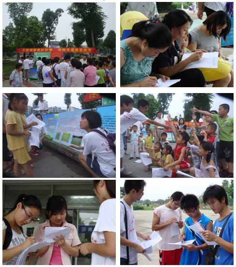 7月11日,团队师生分三组分别来到居民社区、巢湖学院和巢湖市西苑广场进行环保宣传。在居民社区和巢湖学院,队员们通过发放宣传单和问卷调查,宣传节能环保的知识,并在来回公交车上与市民进行沟通,呼吁更多的人加强环保意识,共建美丽巢湖;在西苑广场,通过展板、发放宣传单等形式向当地市民宣传讲解低碳生活和节能环保的知识,向市民介绍巢湖蓝藻的基本情况。通过组织广场小朋友进行环保知识竞答的方式将此次宣传活动推向了高潮。