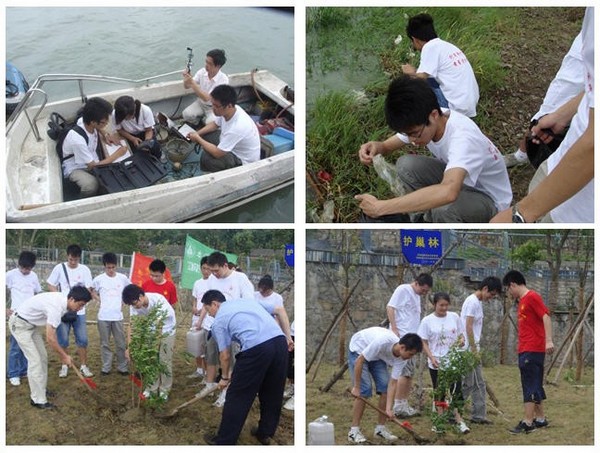 7月10日,团队师生乘小艇来到巢湖湖面,对风向风速,水体PH、溶氧量、透明度等进行测量并记录数据。接着队员们进行了义务植树活动,巢湖渔政站罗站长也亲临植树现场,双方在巢湖湿地共同建立了“护巢林”,寓意“保护巢湖、保护家园”。