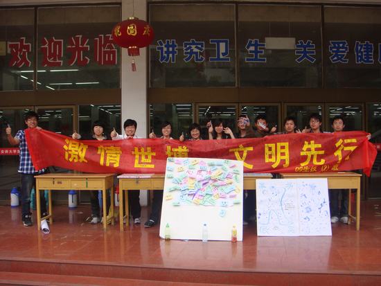 在2010年中国上海世博会即将到来之际,4月25日,生科院生物技术专业同学举办了以“激情世博,文明先行”为主题的宣传教育活动。